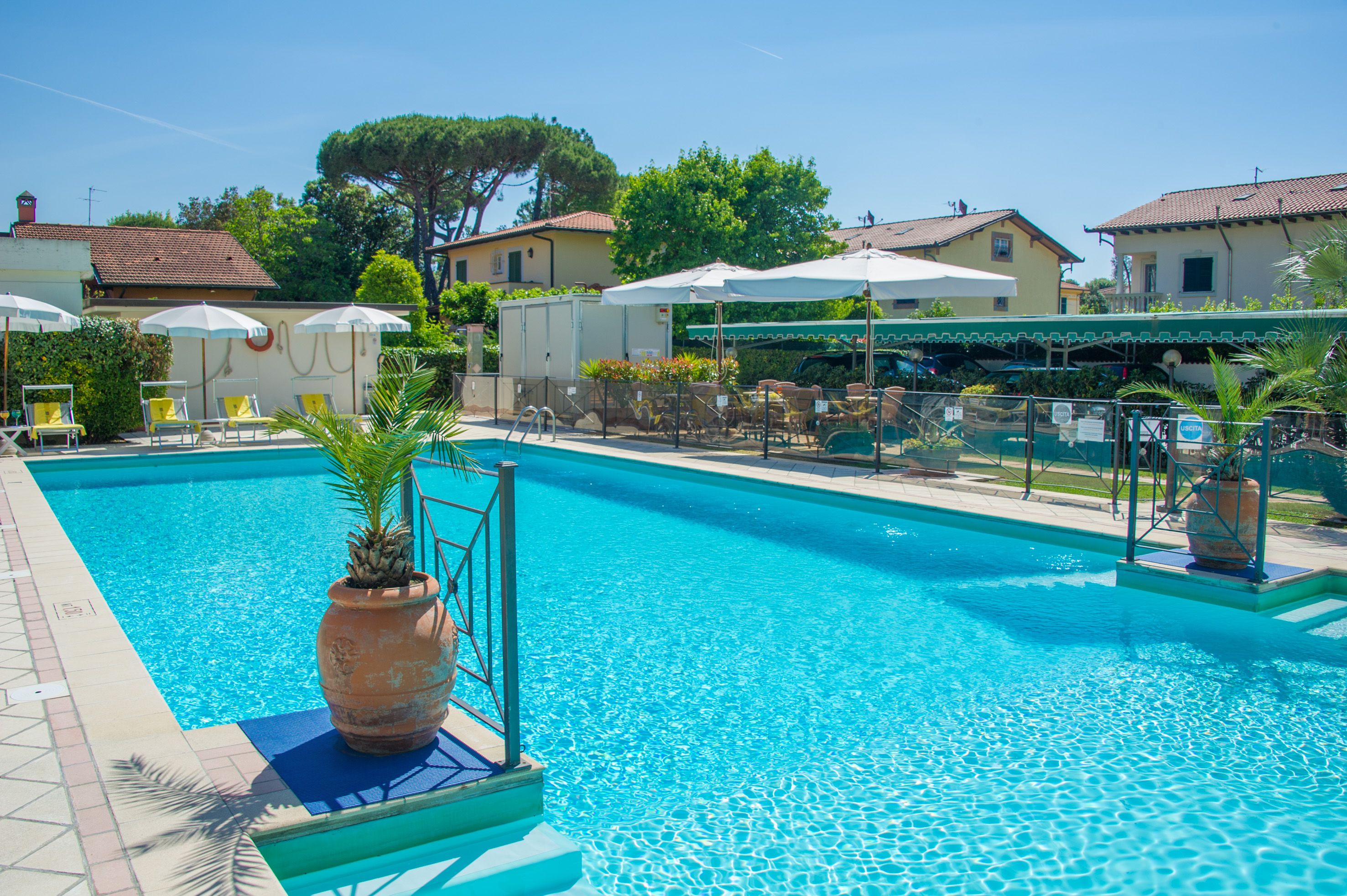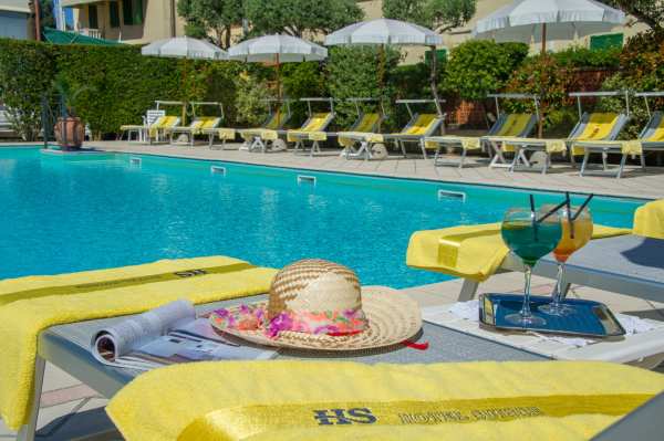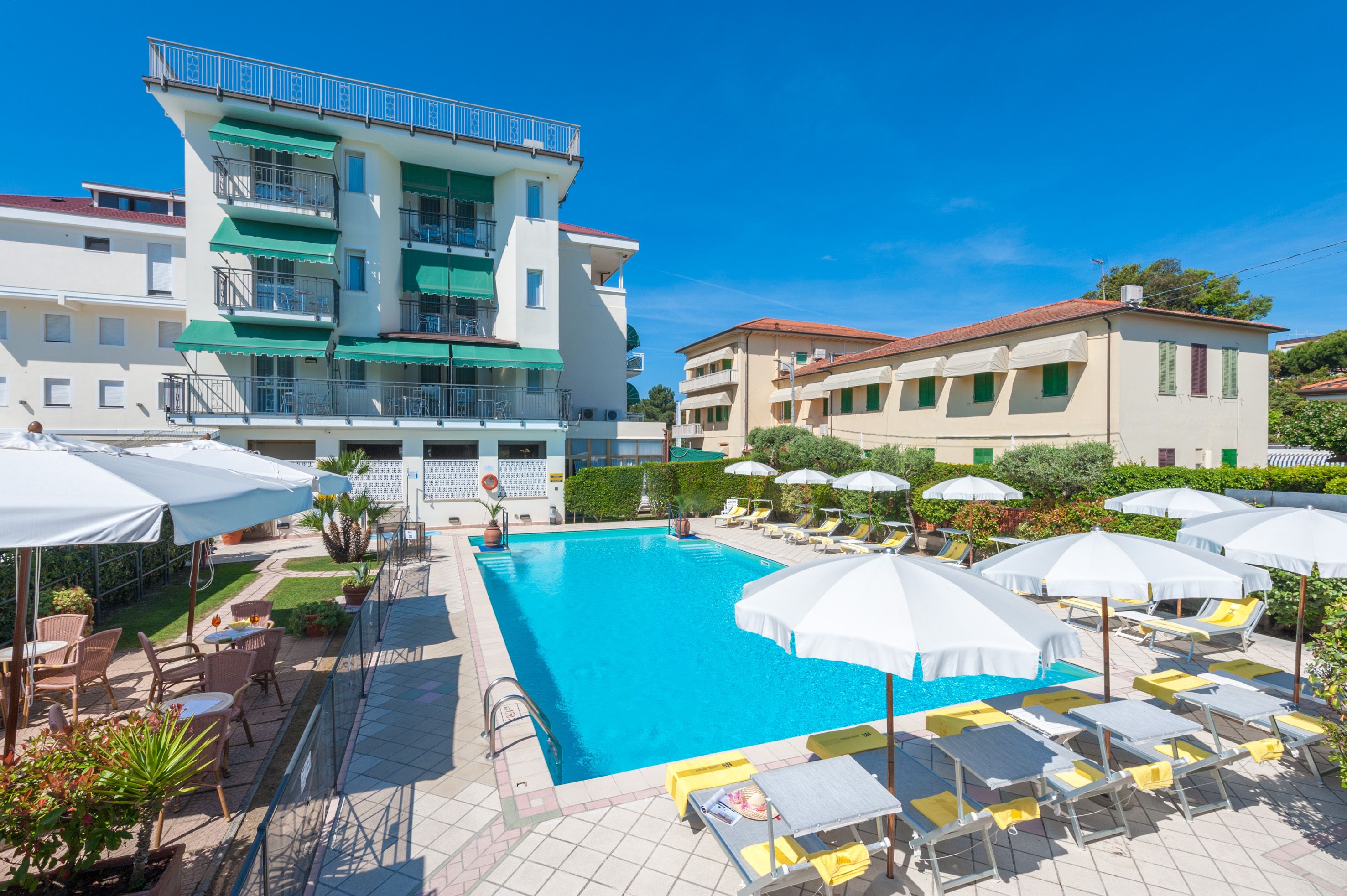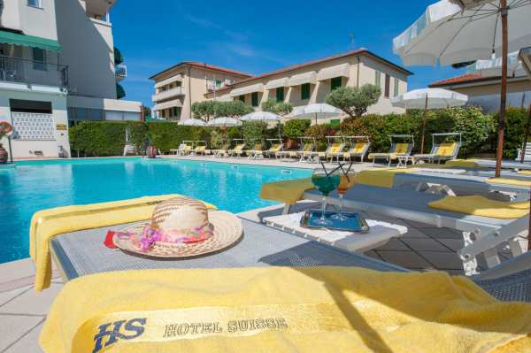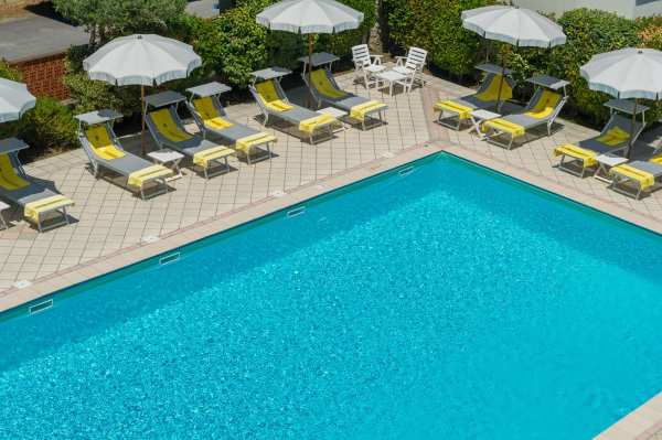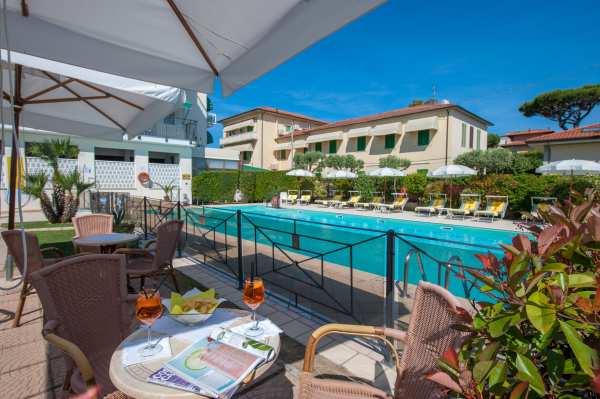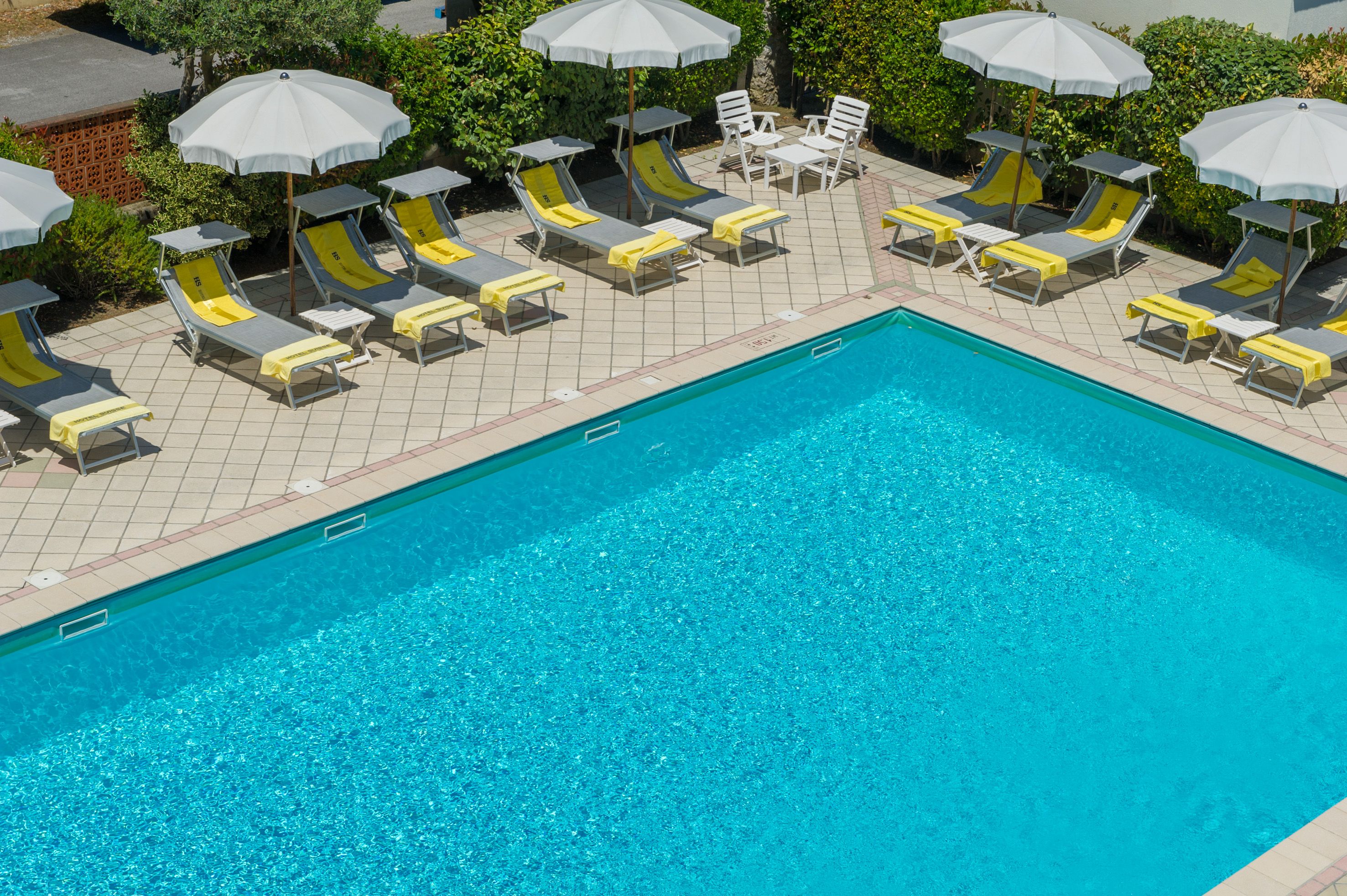 Das Hotel verfügt über ein einladendes Schwimmbad mit Sonnenterrasse, ausgestattet mit Sonnenschirmen und bequemen Liegen, der ideale Ort, um sich in den warmsten Stunden des Tages zu entspannen. Ein ruhiger Bereich, perfekt, um nach einem Strandtag oder Ausflug in die Versilia neue Energie zu tanken.