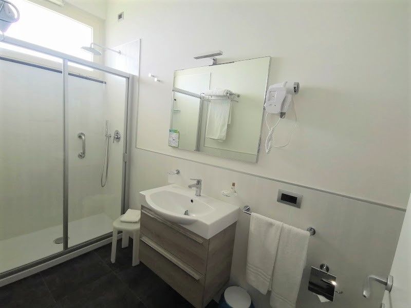 Gemeinschaftsbad für beide Zimmer, ausgestattet mit Parkettboden und Terrasse mit Meerblick (Superior).